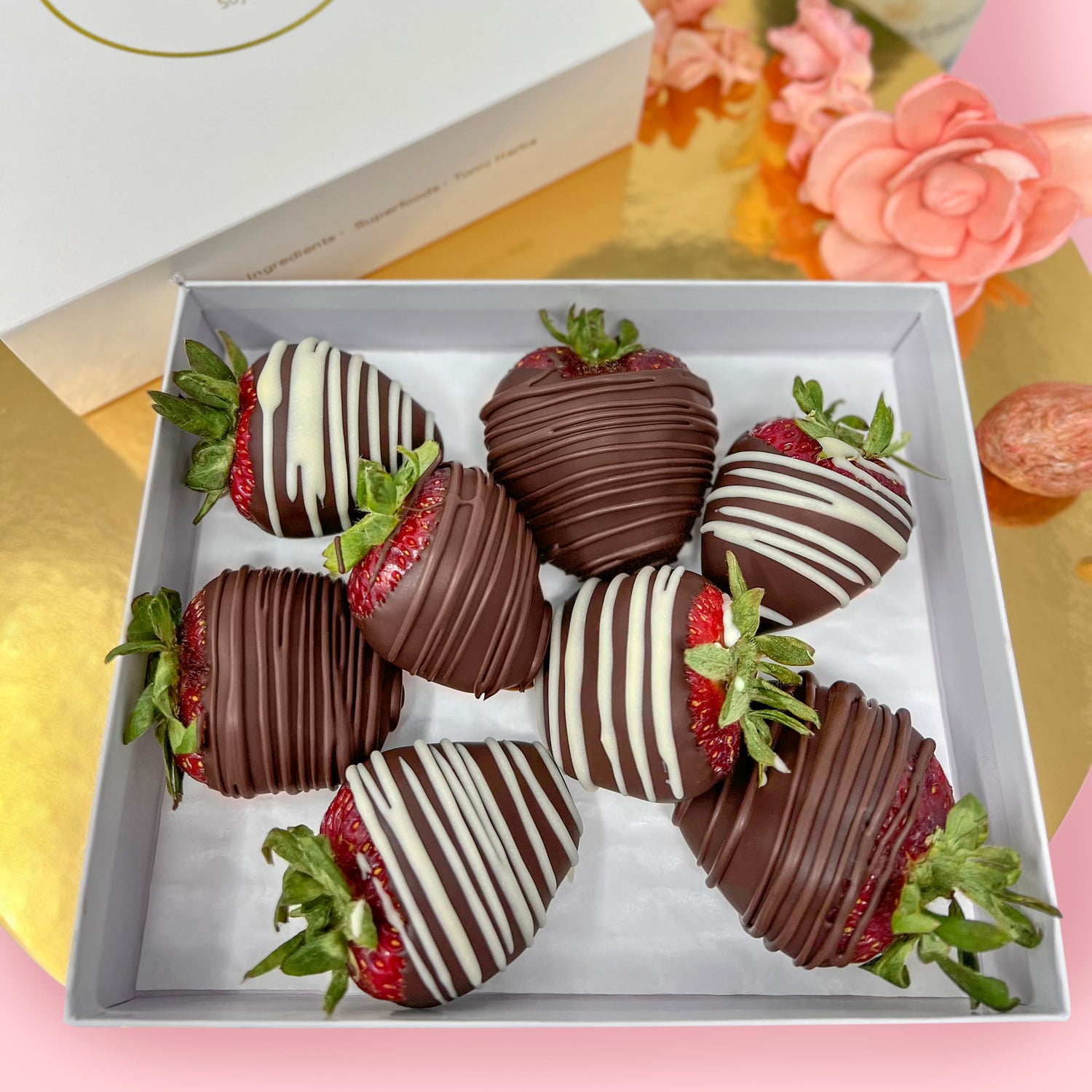 A decadent treat of our organic, juicy strawberries from our San Diego local farmers market that are hand-dipped into a bath of rich dark Belgian Dark Chocolate.